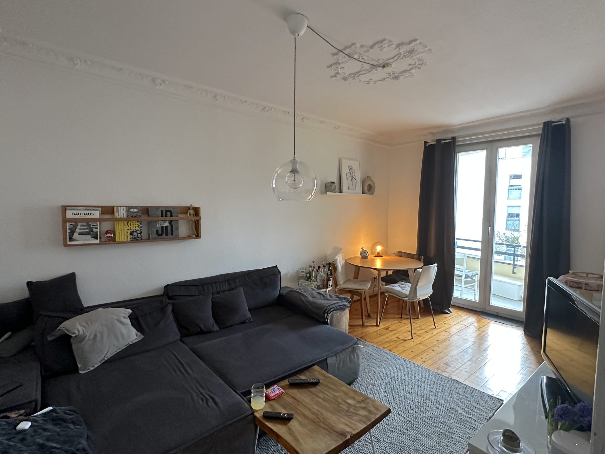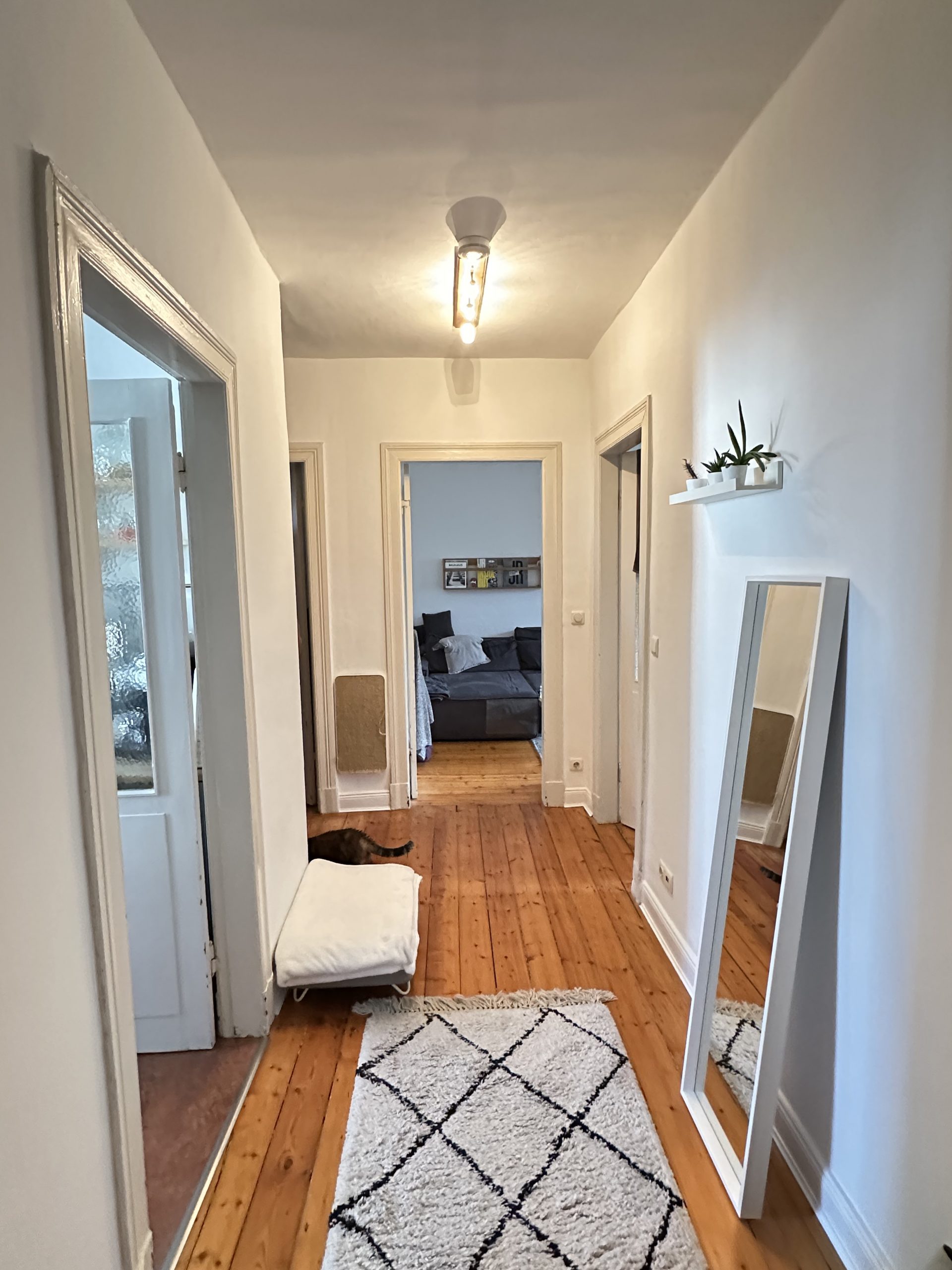 Der Bodenbelag in den Wohnräumen und im Flur besteht aus den originalen Pitchpinedielen, die dem Altbaucharme der Wohnung Ausdruck verleihen und für ein wohnliches Ambiente sorgen.