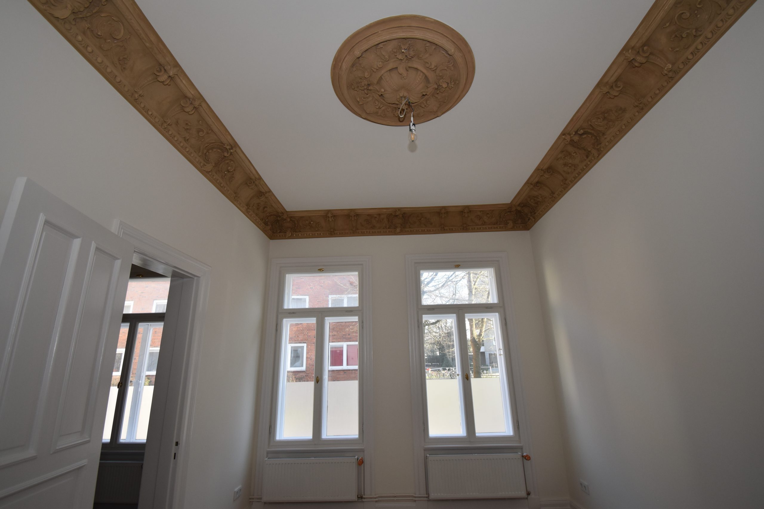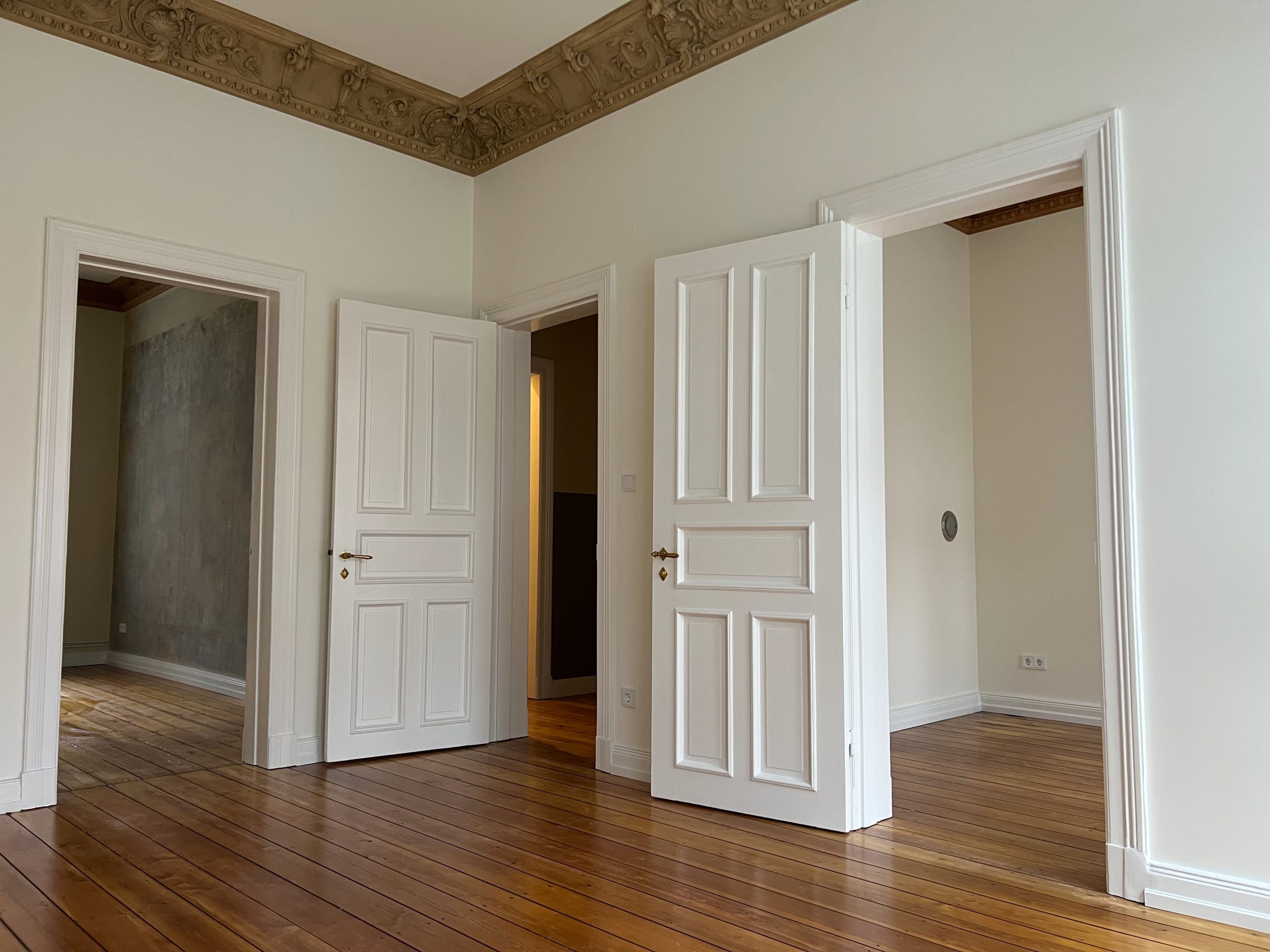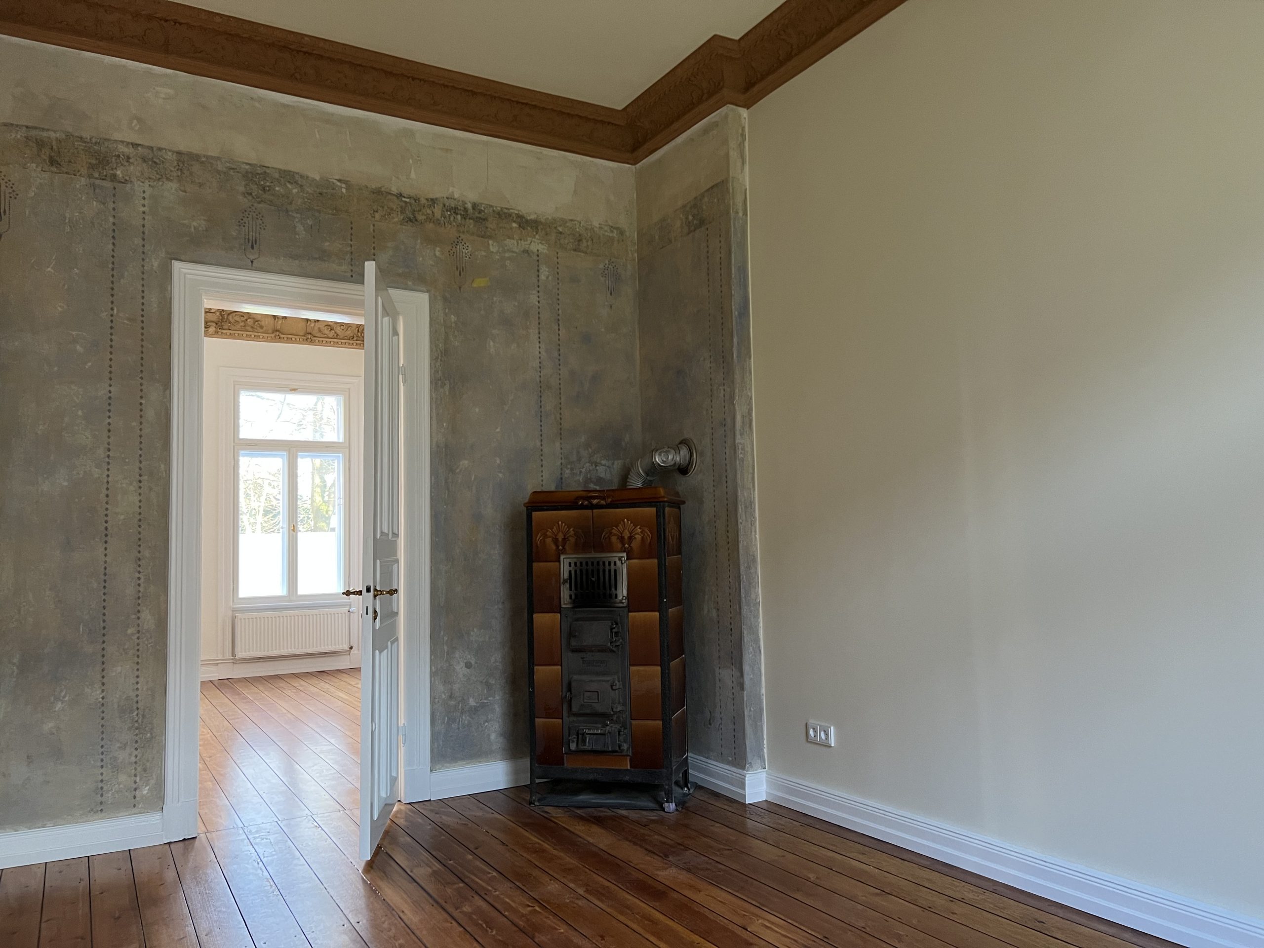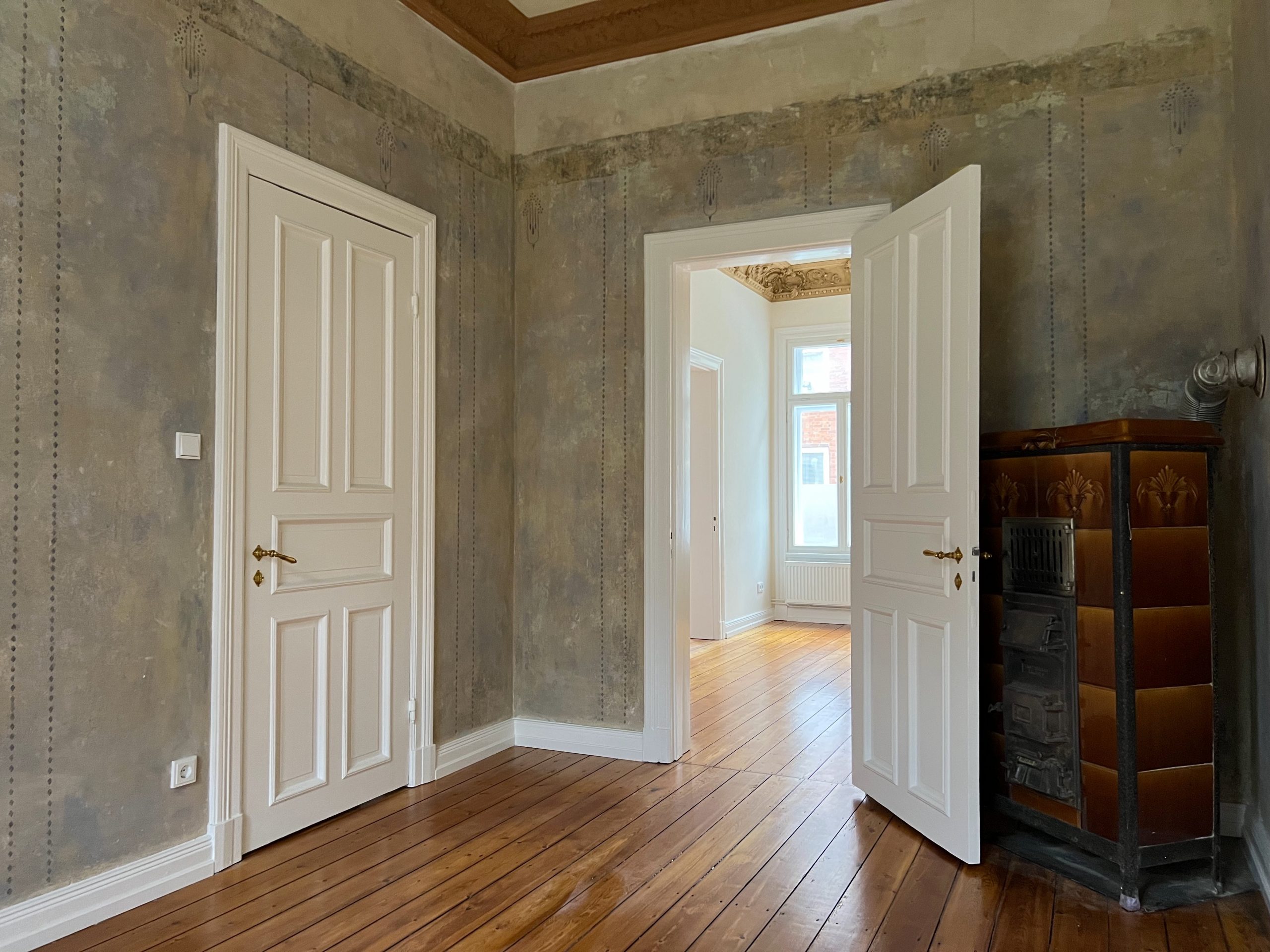 Die wunderschöne Altbauwohnung wurde gerade umfassend renoviert bzw. teilsaniert. Die Arbeiten umfassten u.a. das Erneuern der elektrischen Versorgungsleitungen inkl. neuer Lichtschalter und Steckdosen, das Einbringen neuer Heizkörper, alle Wände wurden mit einem Feinspachtel versehen und neu gestrichen. In der Wohnung wurde tlw. die Originalfarbigkeit der Wände rekonstruiert. Der vorhandene Stuck wurde restauriert und originalgetreu farblich gefasst, die Pitchpinedielen (aus dem Ursprungsbaujahr des Hauses) wurden geschliffen und versiegelt. Es wurde darauf geachtet, dass alle Stilelemente (z.B. Türblätter/Türzargen) in der Wohnung verblieben. Alle Holzteile wurden bis aufs Holz abgebrannt und mit weißer Farbe lackiert. Die Türbeschläge wurden ebenfalls erneuert und sind den Originalbeschlägen nachempfunden. Im Duschbad/WC sind die Sanitärkeramik und die Armaturen erneuert worden. Neue Fliesen wurden hier ebenfalls eingebracht. In der Küche blieb ein historischer Fliesenspiegel erhalten. Weitere schöne Details können vor Ort erkundet werden.