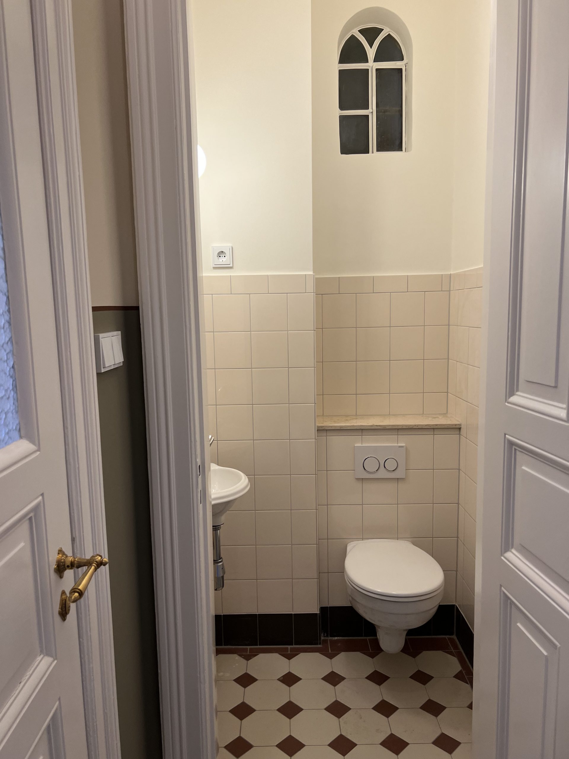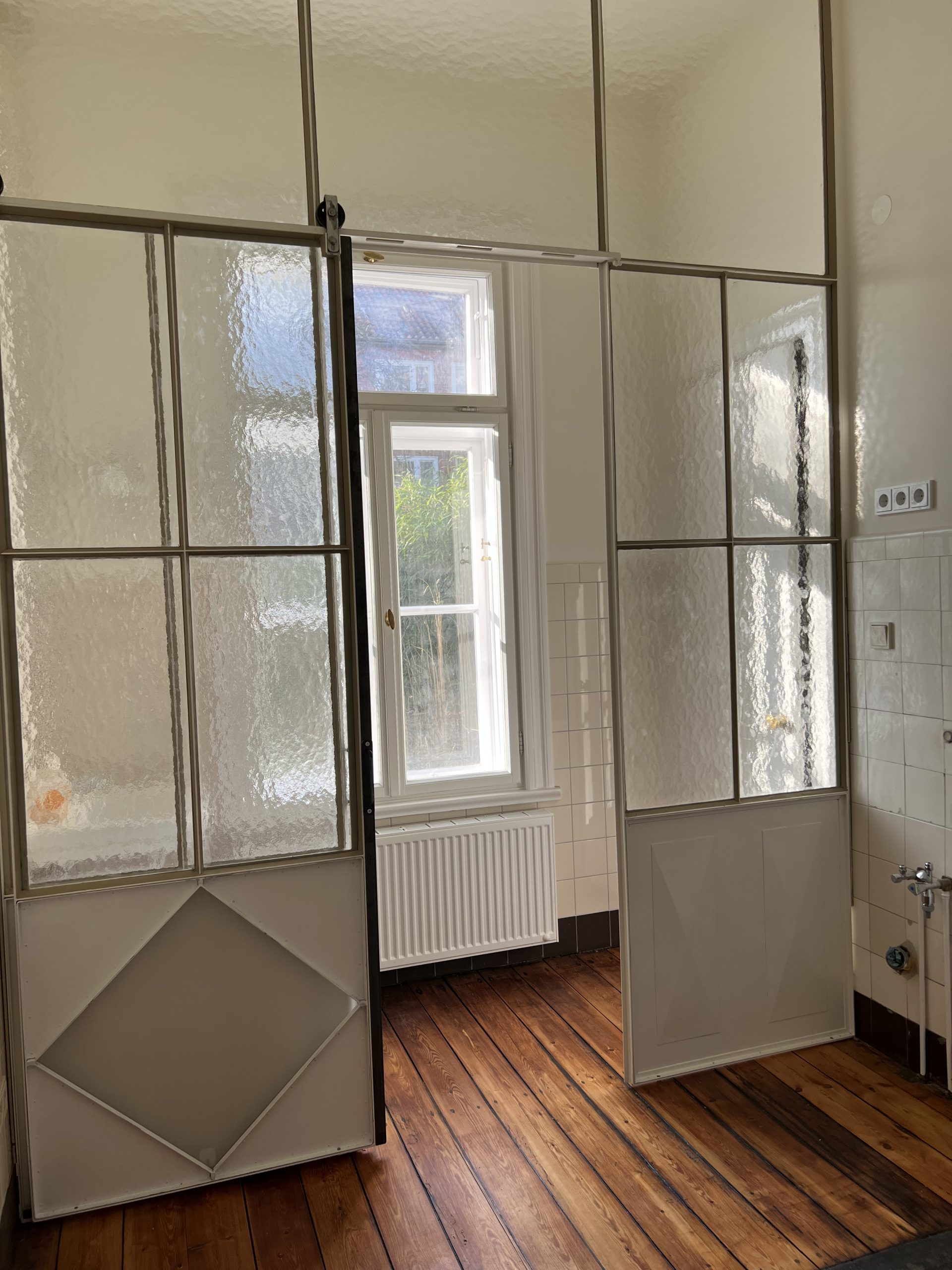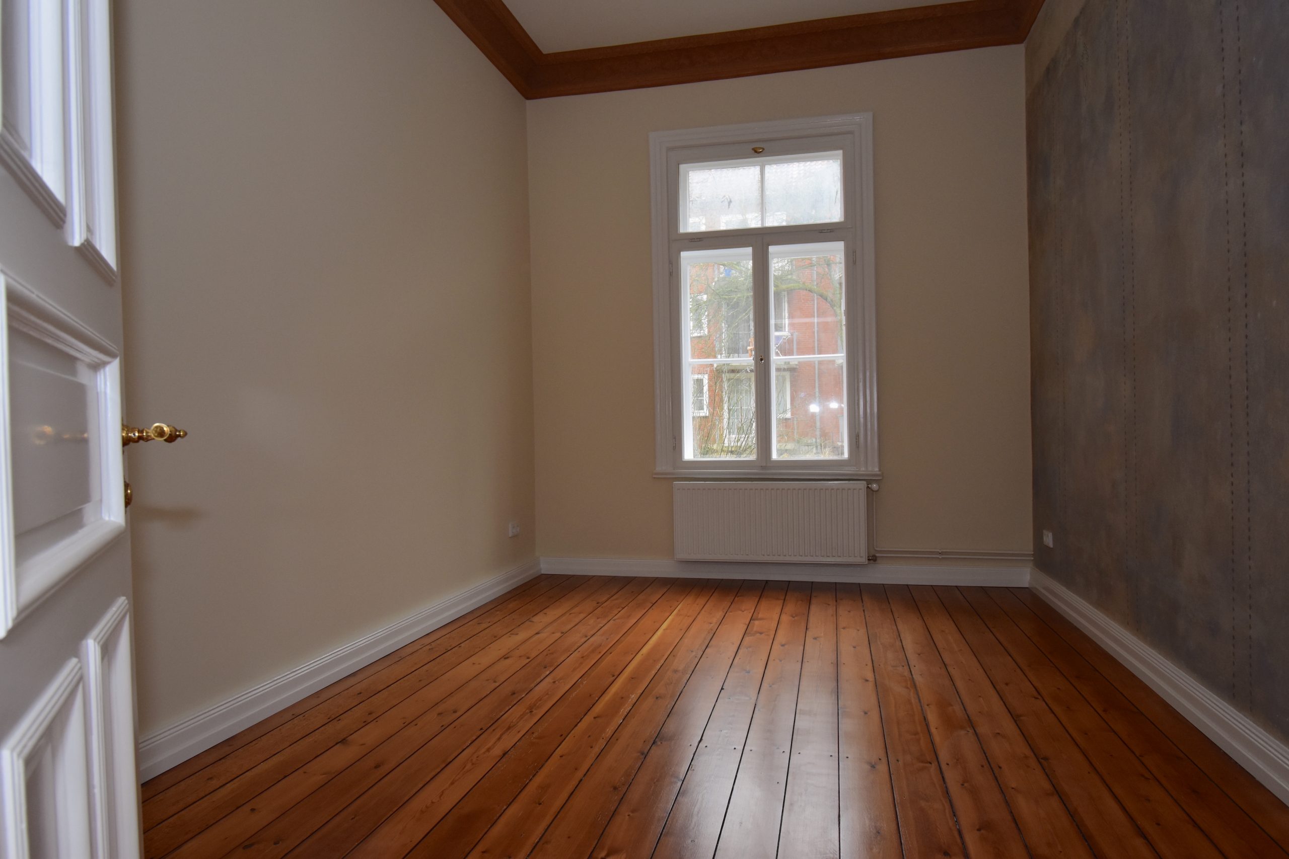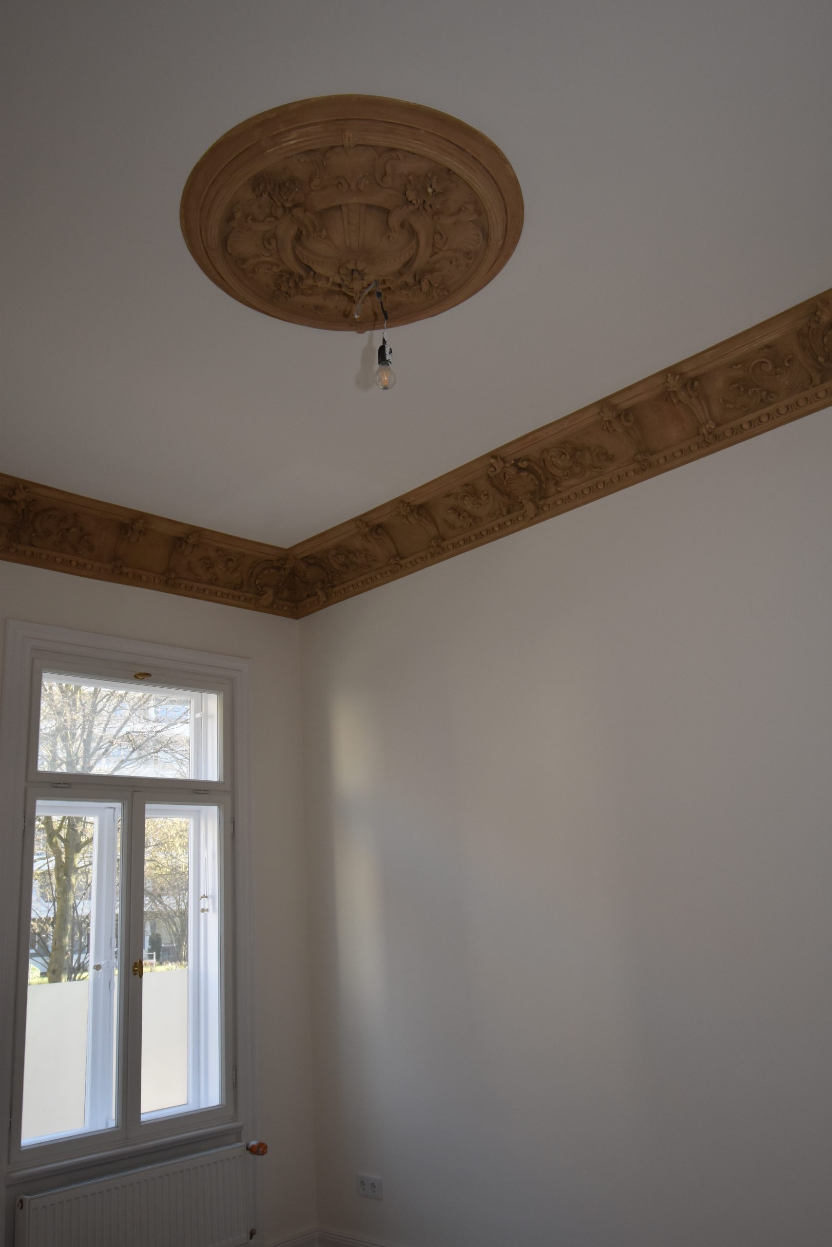 Die wunderschöne Altbauwohnung wurde gerade umfassend renoviert bzw. teilsaniert. Die Arbeiten umfassten u.a. das Erneuern der elektrischen Versorgungsleitungen inkl. neuer Lichtschalter und Steckdosen, das Einbringen neuer Heizkörper, alle Wände wurden mit einem Feinspachtel versehen und neu gestrichen. In der Wohnung wurde tlw. die Originalfarbigkeit der Wände rekonstruiert. Der vorhandene Stuck wurde restauriert und originalgetreu farblich gefasst, die Pitchpinedielen (aus dem Ursprungsbaujahr des Hauses) wurden geschliffen und versiegelt. Es wurde darauf geachtet, dass alle Stilelemente (z.B. Türblätter/Türzargen) in der Wohnung verblieben. Alle Holzteile wurden bis aufs Holz abgebrannt und mit weißer Farbe lackiert. Die Türbeschläge wurden ebenfalls erneuert und sind den Originalbeschlägen nachempfunden. Im Duschbad/WC sind die Sanitärkeramik und die Armaturen erneuert worden. Neue Fliesen wurden hier ebenfalls eingebracht. In der Küche blieb ein historischer Fliesenspiegel erhalten. Weitere schöne Details können vor Ort erkundet werden.