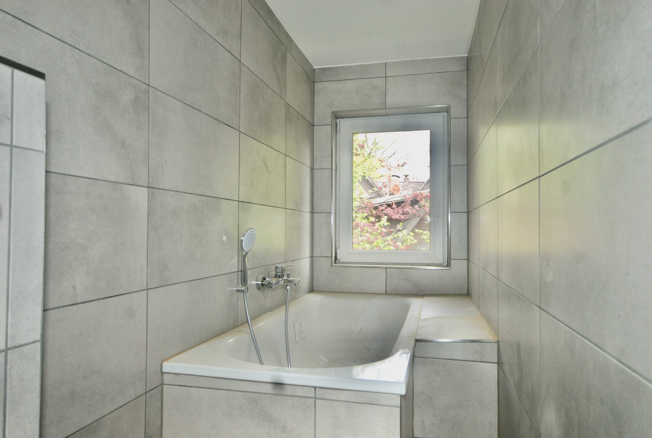 Das hell gestaltete Duschbad ist sehr geschmackvoll und mit hochwertigen, großformatigen Fliesen ausgestattet. Eine bodengleiche Walk-In-Dusche lässt bei Duschfans das Herz höher schlagen.