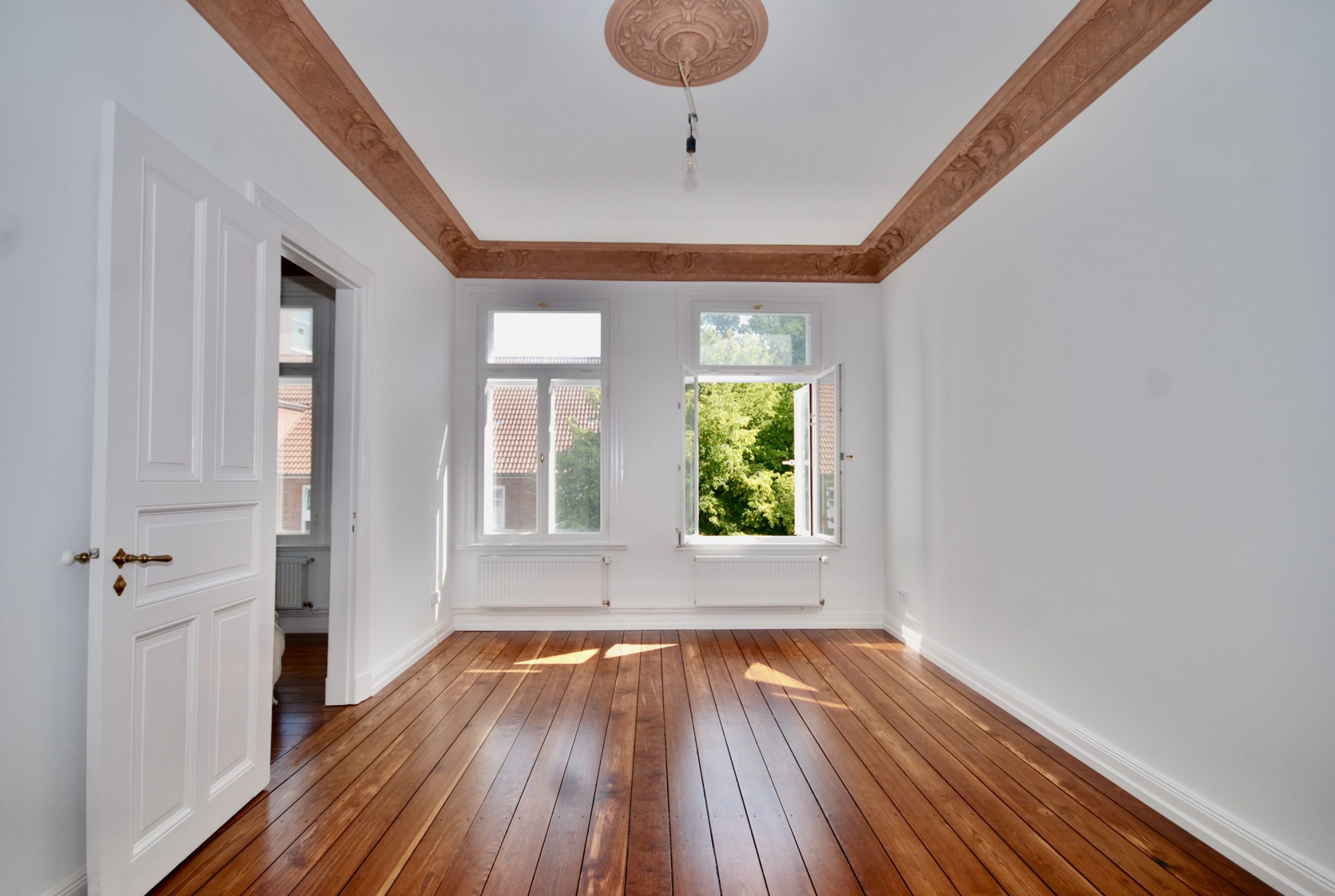 Der Bodenbelag besteht durchgehend aus Pitchpinedielen aus dem Ursprungsbaujahr des Hauses. Er wurde sehr schön aufgearbeitet und verleiht der Wohnung zusammen mit dem Stuck ein sehr angenehmes Ambiente.